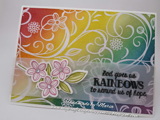 I then cut a strip of vellum and heatembossed a sentiment of the the Over the Rainbow stampset from SU in black on it. The sentiment is about Rainbows and so it´s a connection of the colors I used on the background. I then adhered it with gluedots and tear & tape to the card.